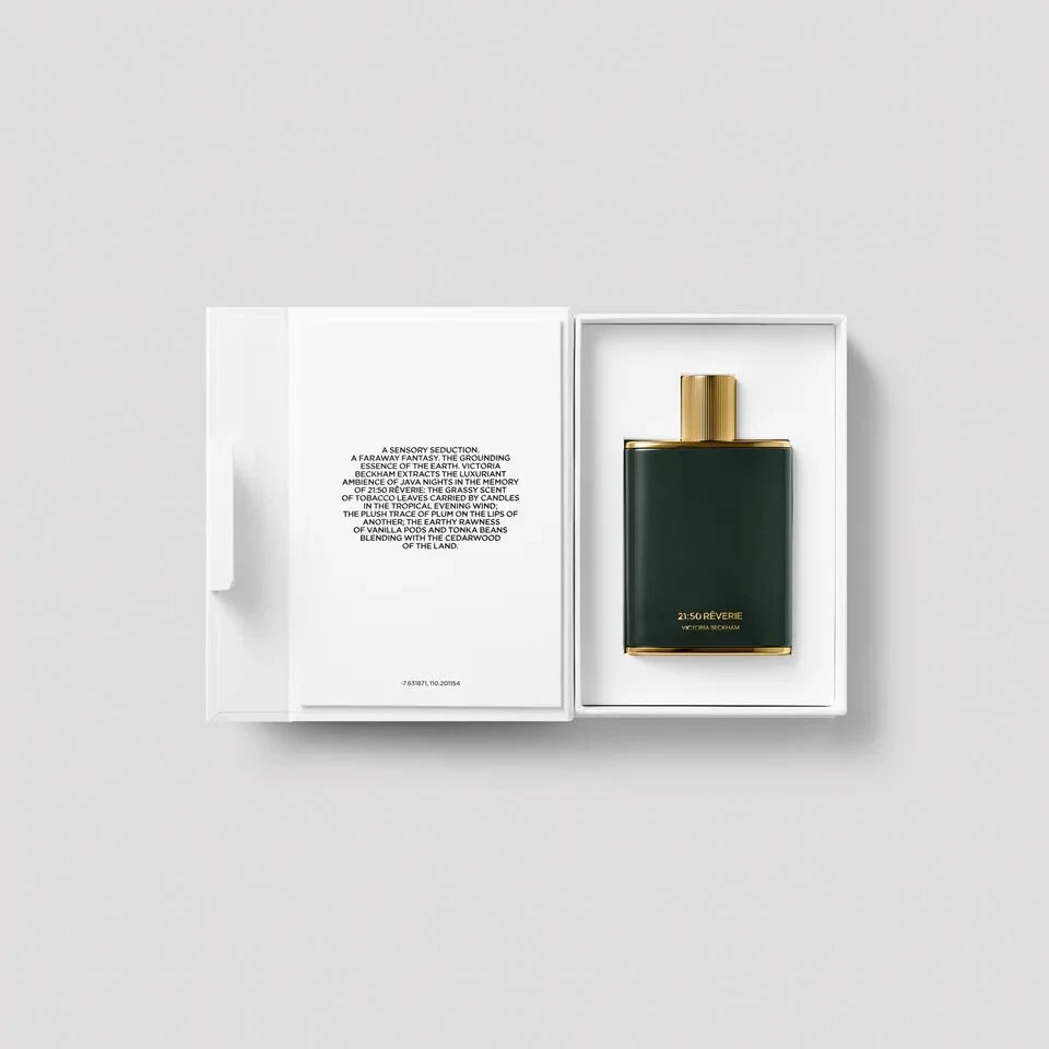 21:50 Rêverie de Victoria Beckham Beauty es una creación de la familia olfativa oriental amaderada, diseñada para hombres y mujeres. Esta fragancia, recién lanzada en 2024, ha sido concebida por el perfumista Jérôme Epinette. Su composición olfativa se despliega con una nota de salida de hojas de tabaco, que da paso a un corazón de ciruela, mientras que su base revela una cálida y envolvente combinación de vainilla, haba tonka y cedro.