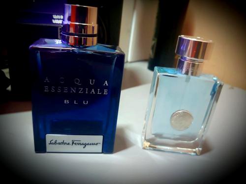 Por un lado sostengo la fragancia Ferragamo Blue y por el otro, Eros Versace EDT. La verdad es que cuesta diferenciar una de otra.