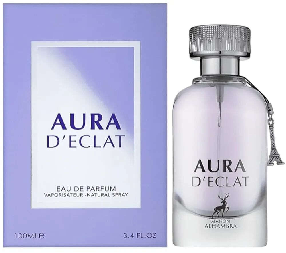 Aura D'Eclat de Maison Alhambra es una fragancia de la familia olfativa Floral para Mujeres. Aura D'Eclat se lanzó en 2022. Las Notas de Salida son lila verde, hojas de té y peonía; las Notas de Corazón son almizcle, flor del duraznero (flor del melocotonero) y hierba; las Notas de Fondo son osmanto chino (olivo oloroso de China), cedro y petit grain.
