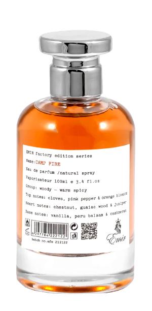 El toque final lo brinda el bálsamo del Perú junto con la vainilla, que suavizan la composición con su dulzura resinoso-amaderada, mientras el cachemira envuelve el aroma en un abrazo cálido y envolvente. Esta sinfonía de notas hace de Camp Fire Emir una elección perfecta para quienes desean dejar una impresión duradera, combinando la elegancia de los ingredientes tradicionales con un toque moderno y audaz.