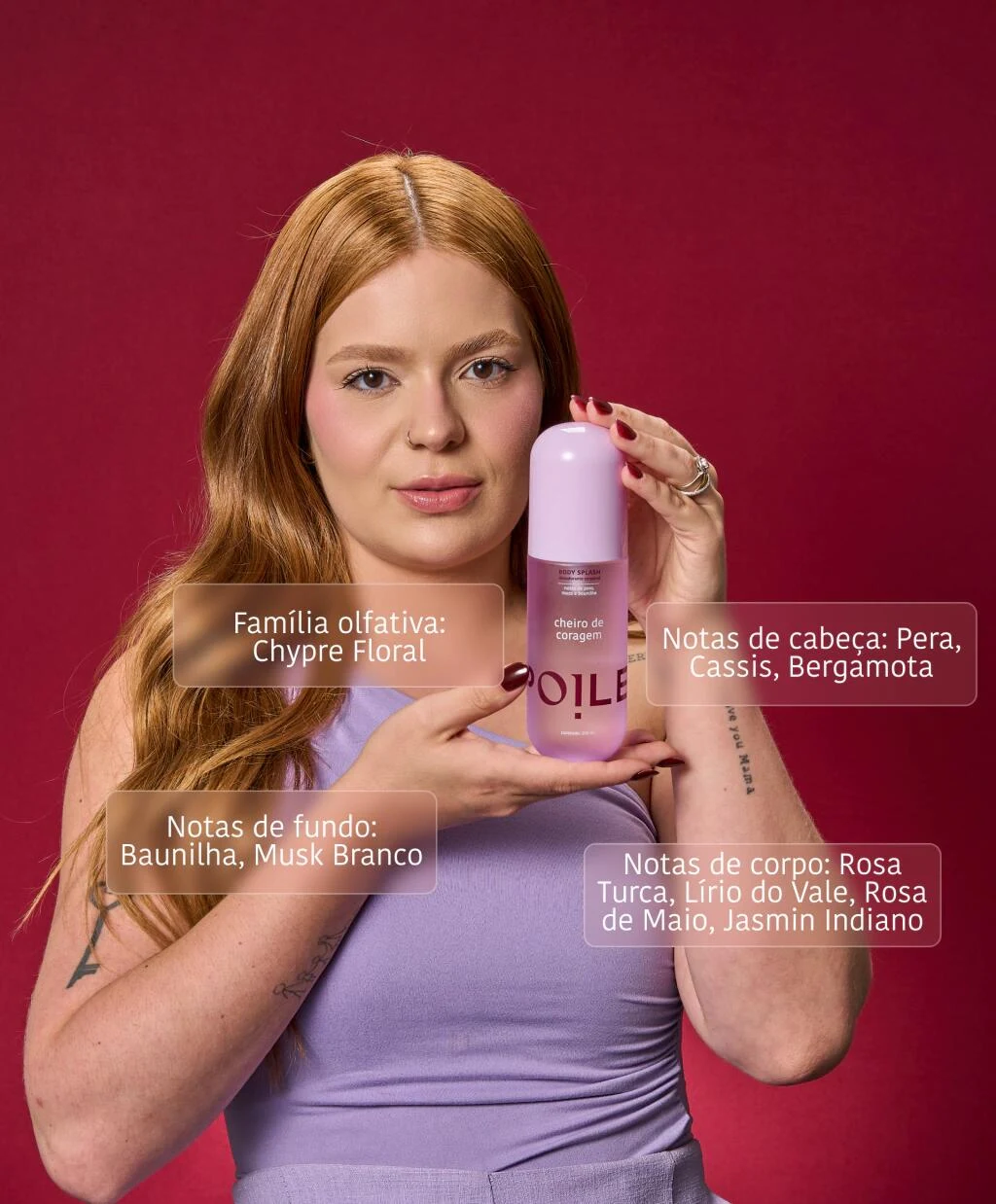Cheiro de Coragem de Spoiler es una fragancia de la familia olfativa chipre floral para mujeres. Esta creación, lanzada en 2025, despliega una pirámide olfativa donde las notas de salida combinan grosellas negras, bergamota, casis y pera. El corazón de la composición revela lirio de los valles, jazmín de la India, rosa turca y rosa de mayo, mientras que las notas de fondo se asientan con almizcle blanco y vainilla.