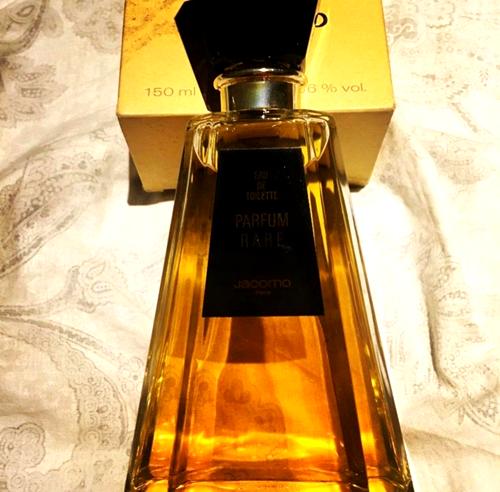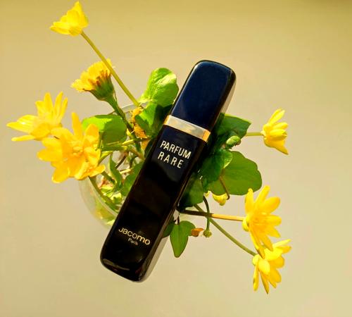 • ¿Alguna mujer hoy en día se atrevería a lucir una mezcla de palo de rosa, cardamomo de Sri Lanka, jazmín egipcio, iris de Florencia, rosa de mayo, vetiver, caléndula, cilantro, siempreviva, musgo de roble, sándalo y pachulí? Porque estas son las notas de un frasco de Parfum Rare de Jacomo EDT que cayó en mis manos en una compra a lo bruto cuando apareció en mi camino una perfumería antigua. Es idéntico a las fotos de arriba de Fragrans: un aroma fuerte, pero no contundente, que vale la pena cazar si buscas una fragancia de estilo clásico, verdaderamente elegante y poco común. Me llena de melancolía compararlo con tantas propuestas actuales. Aquí tenemos un suelo de musgo y madera con especias y flores que dan vida a un chypre que se transforma en un jardín paradisíaco inalcanzable, con buen empuje, encanto y sabor. Un ejemplar fulgurante de retro enérgico y para nada dócil, ¿serás capaz de domarlo? Las notas se combinan y fluyen tan bien que no es sencillo sentir la transición. Es una de esas fragancias con tantas facetas que ni siquiera puedes ponerlas en una declaración. La sensación ahumada probablemente se debe a un vetiver muy seco; todo el perfume es picante al principio, pero después de más de dos horas se vuelve suave y tranquilo, predominando notas cremosas de madera entrelazadas con flores cálidas, todavía suavemente especiadas. Con esta fragancia, la siempreviva y el musgo de roble te acarician y calientan la piel tan bien que es difícil dejar de oler semejante aroma. Algo fuera de los esquemas habituales que me ha transportado de vuelta a la inalcanzable época dorada de la perfumería.