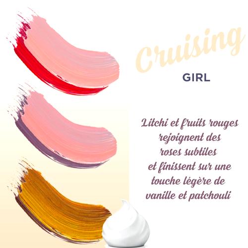El viaje olfativo culmina en una base profunda y envolvente donde el pachulí, el benjuí y la vainilla se entrelazan magistralmente, dejando una estela cálida y seductora que perdura en el tiempo. La atomización de Cruising Girl evoca esa libertad y dulzura que caracteriza a la mujer contemporánea, haciéndola una elección perfecta para el día a día o para esas ocasiones especiales donde quieras dejar una impresión memorable.
