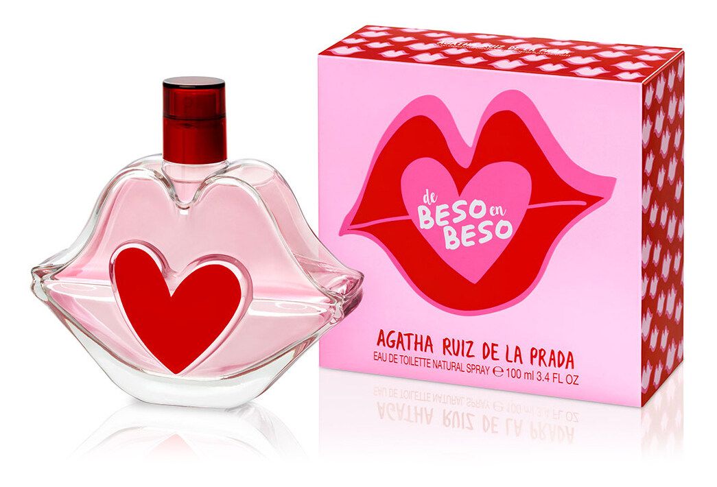 De Beso en Beso de Agatha Ruiz de la Prada es una fragancia de la familia olfativa Almizcle Floral Amaderado para Mujeres. Esta fragrancia es nueva. De Beso en Beso se lanzó en 2024. Las Notas de Salida son bergamota, mandarina y Frutas rojas; las Notas de Corazón son iris, flor de azahar del naranjo, pimienta rosa y rosa; las Notas de Fondo son cedro, crema batida, almizcle y sándalo.