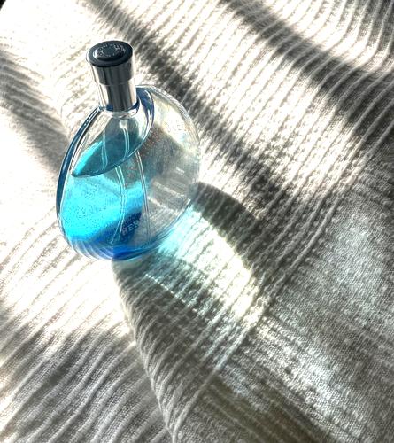 Sumergida en un universo azul de maravillas: frescura dulce y cítrica que evoca olas suaves, un poco de viento y sal, cristales y libertad solar. Un diseño exquisito de Hermes para un verano acuático, casi unisex.