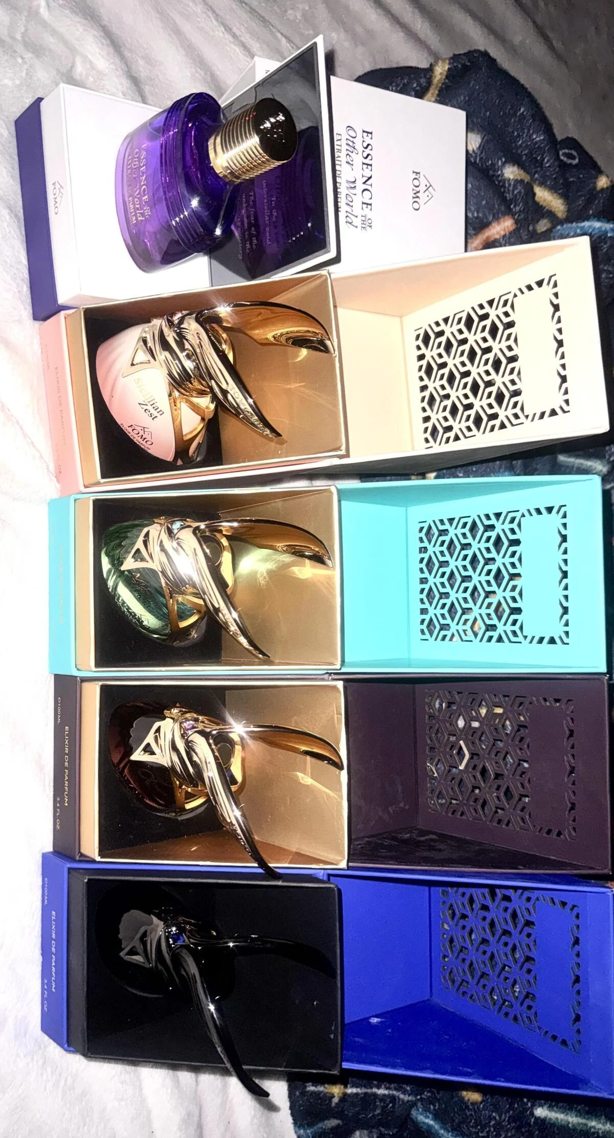 Essence of the Other World de FOMO es una creación de 2025 perteneciente a la familia olfativa almizclada floral amaderada, diseñada para hombres y mujeres. Esta nueva fragancia despliega una pirámide olfativa donde las notas de salida combinan jazmín, neroli, eucalipto y anís; el corazón revela una armonía de flores blancas, ámbar, rosa y heliotropo; y el fondo se asienta sobre vainilla, pachulí, cedro y mirra.