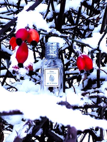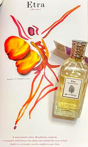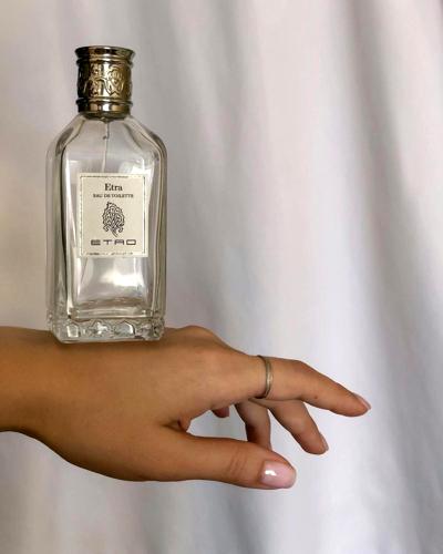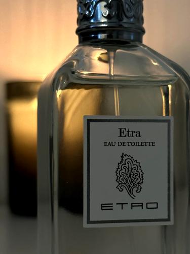 El perfume Etra inicia con un toque especiado, donde destaco el aroma a pimienta y cilantro, aunque también me da la sensación de sentir pimienta entre sus notas. Además, noto una presencia fuerte de cardamomo y un ligero aroma que me recuerda al anís, aunque no estoy seguro de a qué se debe exactamente. Después de un rato, aparecen las notas florales, donde el geranio se hace notar, además de un trasfondo amaderado.