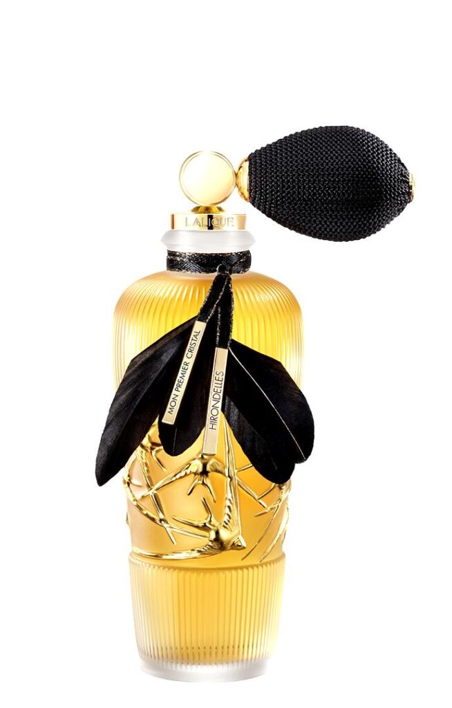 El carácter único de Hirondelles Lalique se profundiza con su base, donde la vainilla de Madagascar se entremezcla con almizcle, aportando una calidez envolvente y sensual. El heliotropo, con su suave toque de almendra y vainilla, añade una última pincelada de suavidad, redondeando la fragancia con una firma inolvidable.