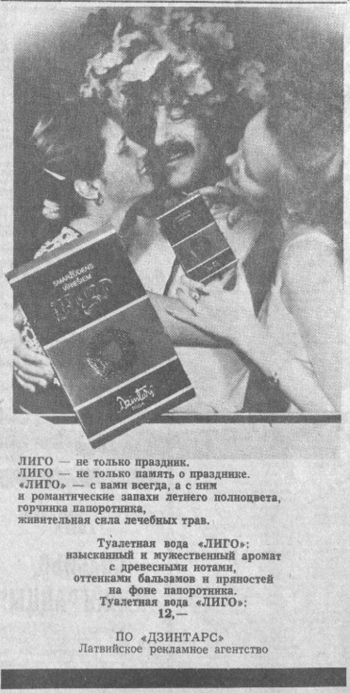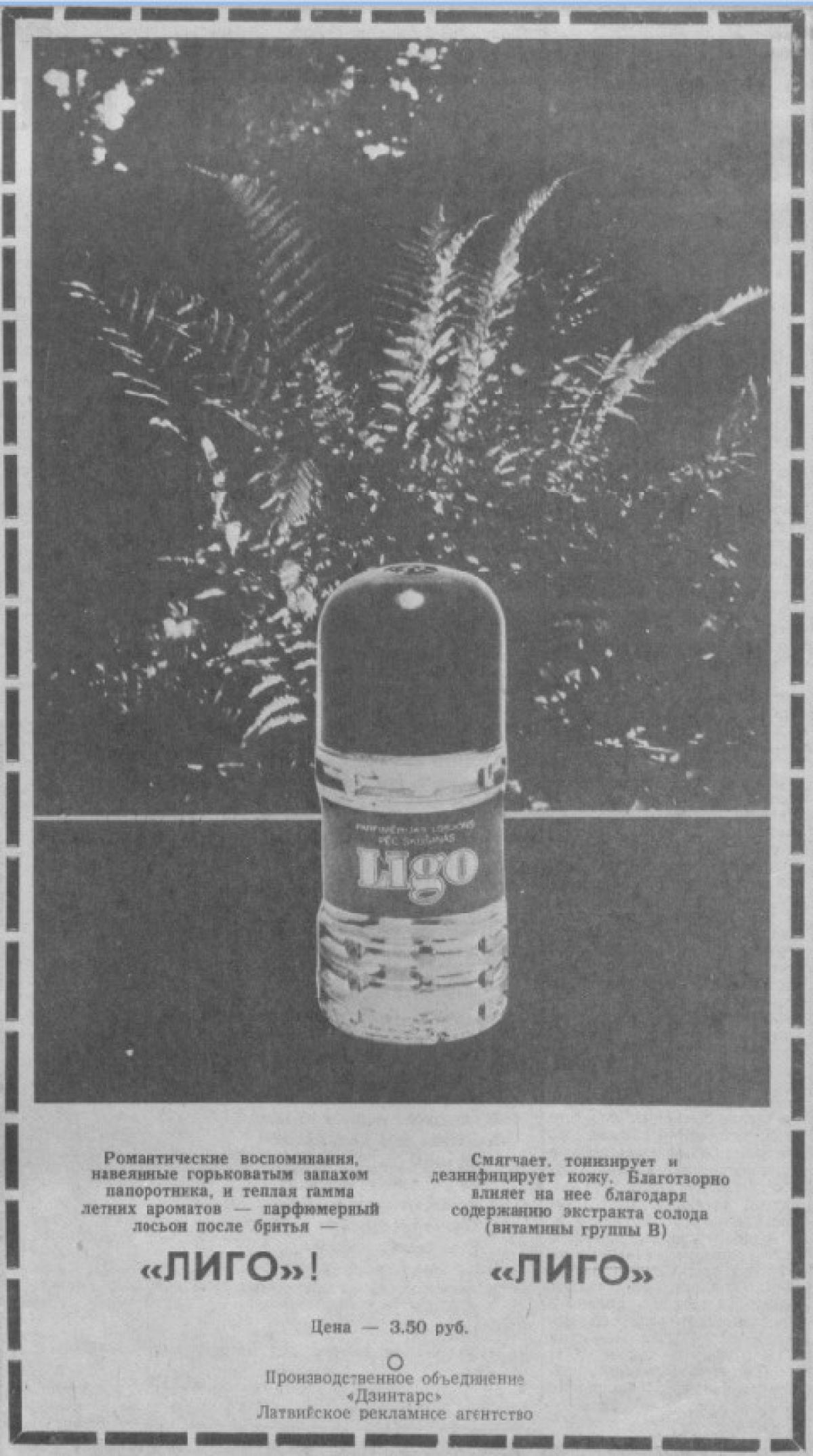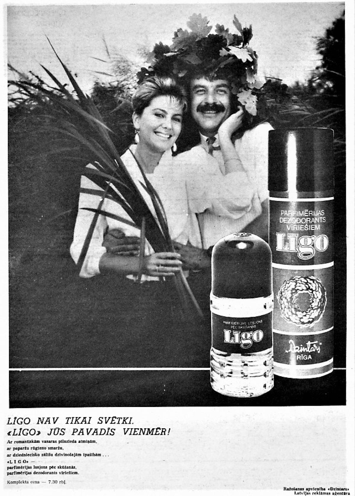 Līgo de Dzintars es una fragancia de la familia olfativa Aromática Fougère para Hombres. Līgo se lanzó en 1988. Las Notas de Salida son bergamota, cítricos, ajenjo (absenta), menta y notas herbales; las Notas de Corazón son notas florales, raíz de lirio, lavanda, cuero, especias y helecho; las Notas de Fondo son bálsamo de Tolú, sándalo, musgo de roble, incienso y cedro.