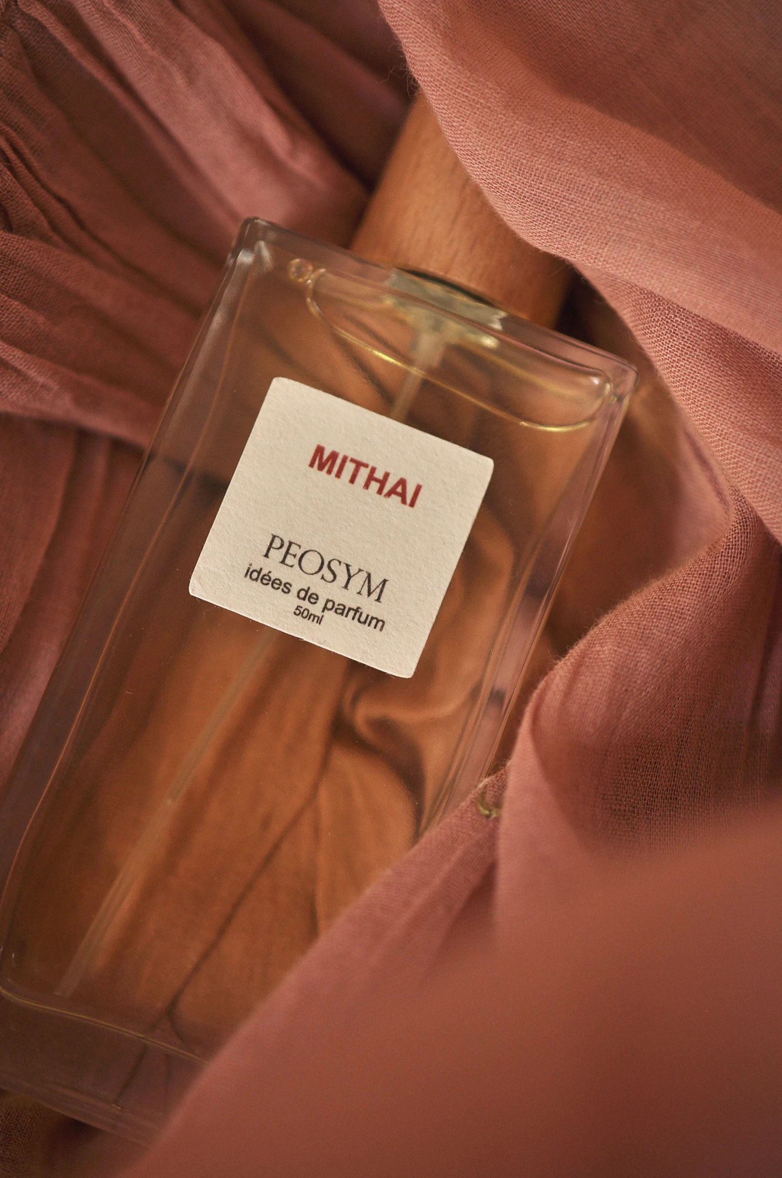 Mithai de PEOSYM es una creación de la familia olfativa oriental vainilla, diseñada para hombres y mujeres. Esta nueva fragancia, lanzada en 2025, ha sido firmada por el perfumista Alexandre Freile. Su pirámide olfativa se despliega con notas de salida de cardamomo y bergamota; un corazón compuesto por té negro, anacardo y rosa; y un fondo cálido de vainilla, crema batida y pachulí.