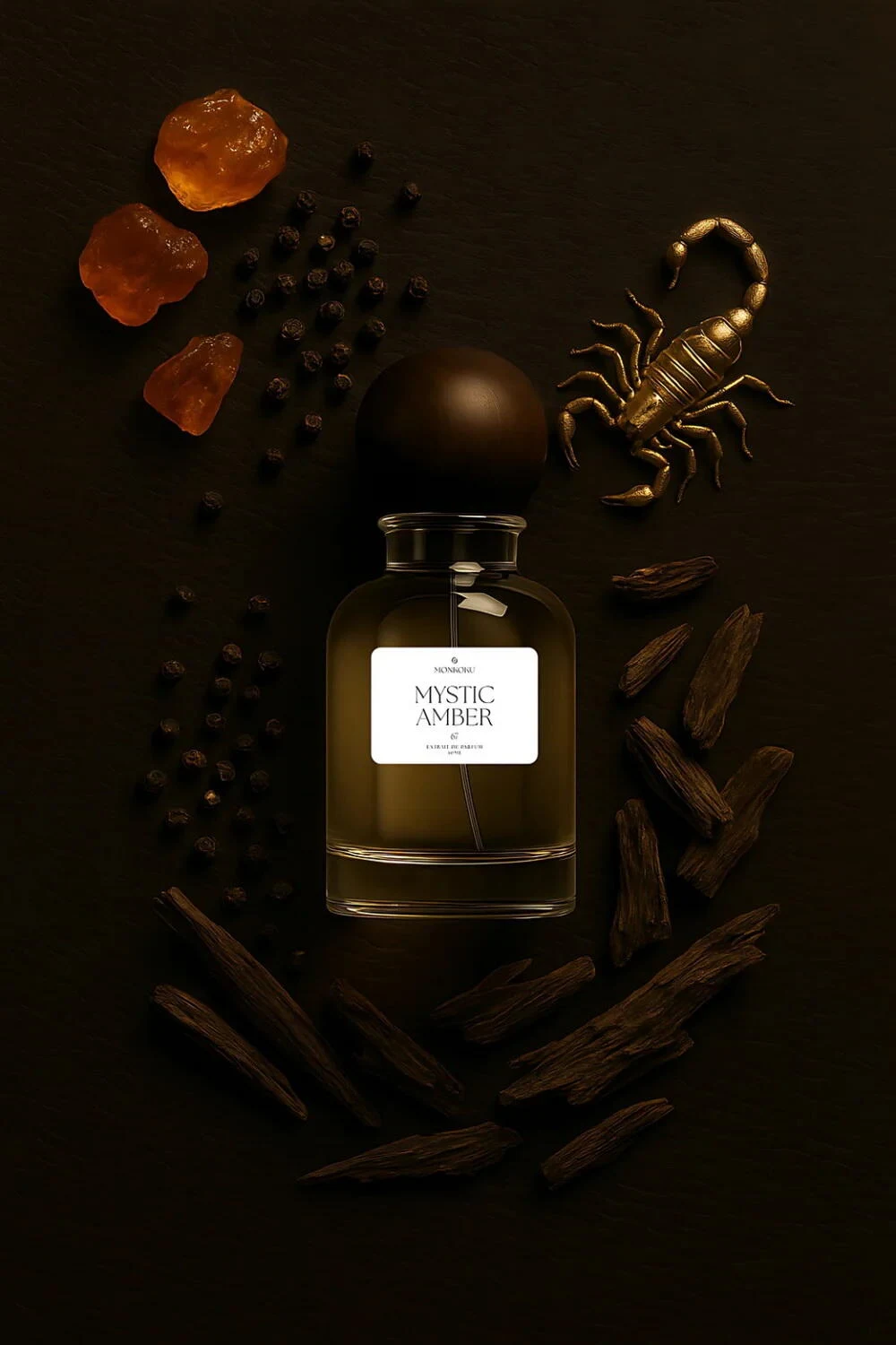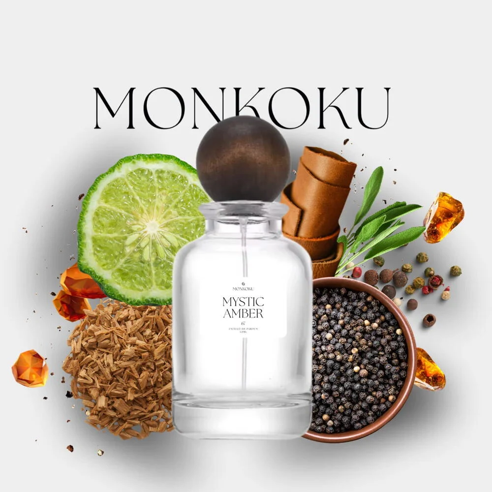 Mystic Amber de Monkoku es una fragancia de la familia olfativa amaderada especiada para hombres y mujeres. Esta creación, lanzada en 2025, despliega una pirámide olfativa compleja y envolvente. Las notas de salida revelan una explosión aromática de pimienta de Sichuan, bergamota, pimienta rosa, pimienta negra y pimiento verde. El corazón de la composición se sostiene sobre un lecho de oud indio, ámbar, tomillo, oud camboyano, salvia y sándalo, mientras que las notas de fondo aterrizan con elegancia en almizcle blanco, almizcle gris, ámbar y cuero.