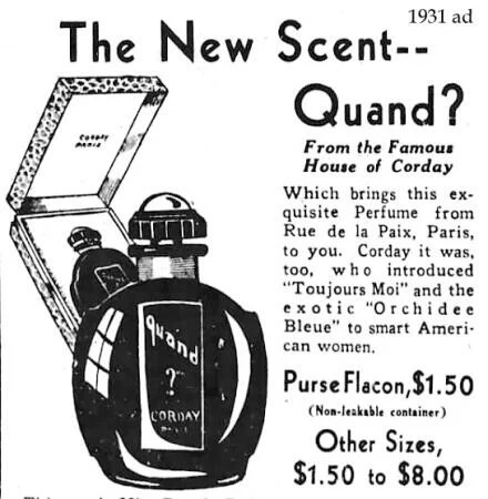 Quand? de Corday es una fragancia de la familia olfativa oriental para mujeres. Lanzada en 1930, esta composición evoca la sofisticación de la época con una estructura olfativa que, aunque los detalles específicos de las notas de salida, corazón y fondo no están detallados en la ficha técnica disponible, se alinea con la tendencia de los perfumes orientales de la década de 1930, caracterizados por el uso de especias, ámbar y almizcles.
