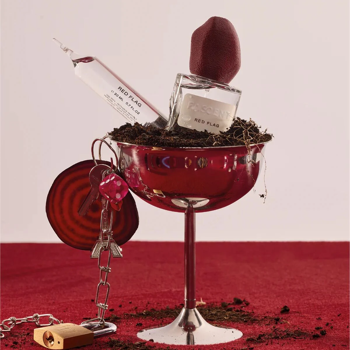 Red Flag de Fascent es una fragancia de la familia olfativa amaderada especiada para hombres y mujeres. Esta creación, firmada por la perfumista Marine Mercé, se lanzó en 2026. Su estructura olfativa despliega en la salida cardamomo, remolacha y jengibre; en el corazón, iris e incienso; y en el fondo, pachulí, haba tonka, palo santo y vetiver.