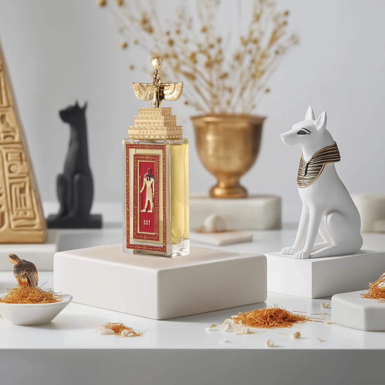 Set de Aswan es una creación olfativa de la familia oriental vainilla, diseñada para hombres y mujeres. Esta fragancia, firmada por el perfumista Ibrahim Al Zoabi, se lanzó en 2025. Su pirámide olfativa despliega en la salida una armonía de flor de azahar del naranjo, ylang-ylang, mandarina y esclarea; en el corazón, el iris, el ámbar, el ládano y el vetiver; y en el fondo, una base cálida de tabaco, heliotropo, notas atalcadas, vainilla y pachulí.