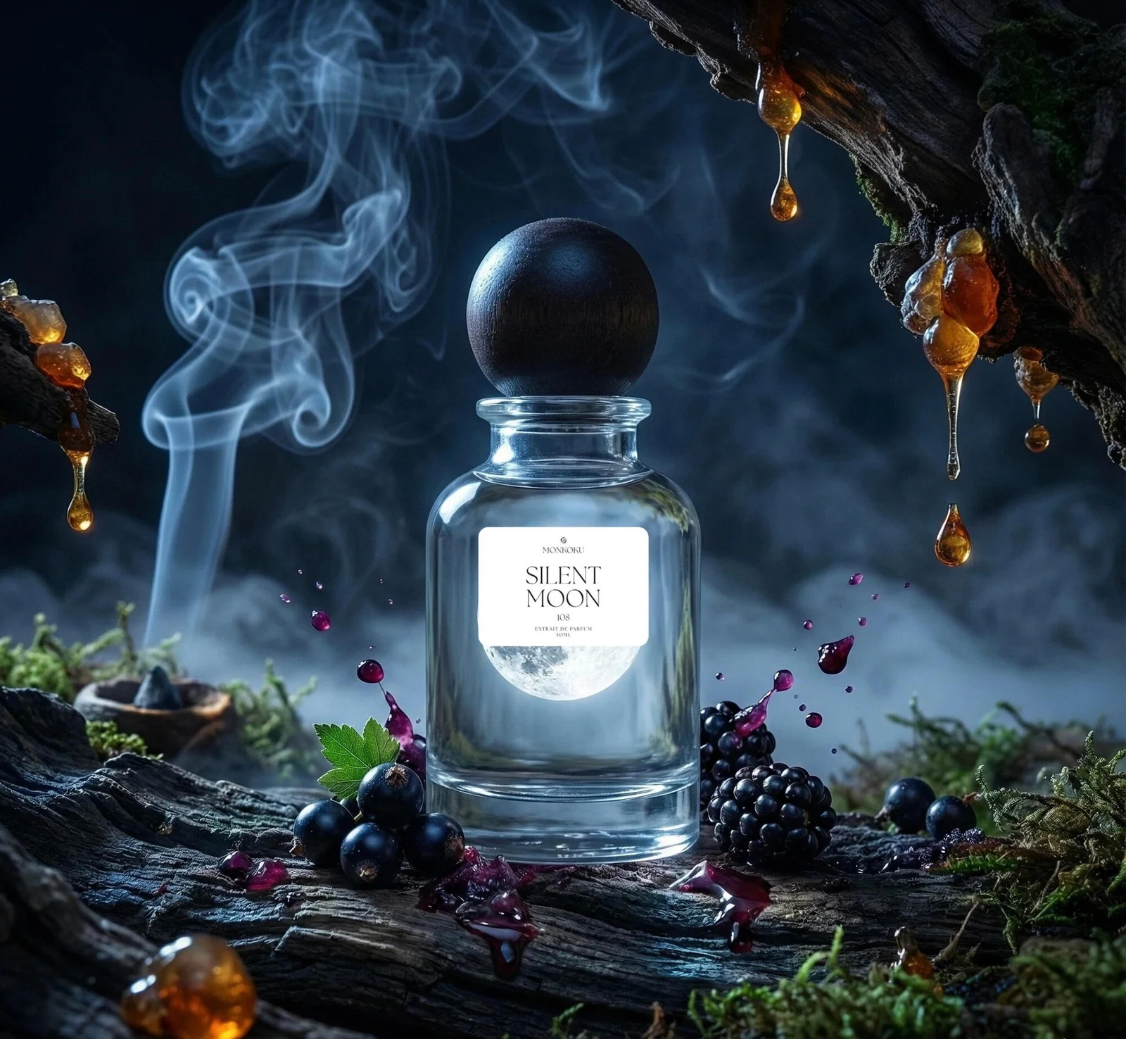 Silent Moon de Monkoku es una fragancia de la familia olfativa oriental amaderada para hombres y mujeres. Esta creación, lanzada en 2025, despliega una pirámide olfativa compleja y evocadora. Las notas de salida revelan una vibrante combinación de zarzamora, naranja, grosellas negras, romero, ládano y davana. El corazón de la composición se sostiene con la delicadeza de la rosa y la retama de olor, entrelazados con incienso, clavo de olor, canela, apio y ron. Finalmente, las notas de fondo aterrizan en una base cálida y profunda formada por rosa silvestre, madera de gaiac, cedro, almizcle, madera de oud, pachulí, opopónaco, ámbar, mirra y musgo.