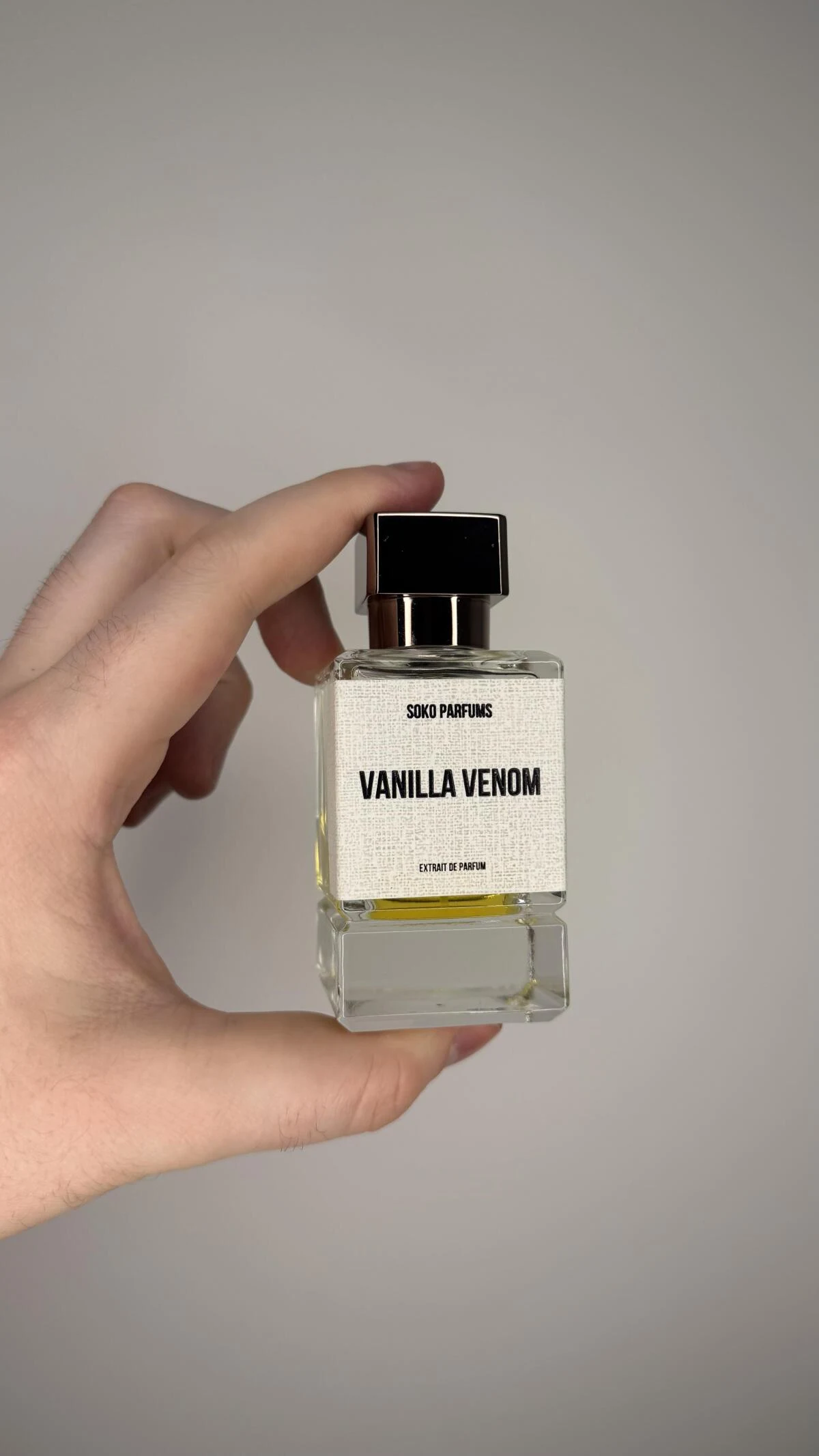 Vanilla Venom de Soko Parfums es una creación de la familia olfativa oriental vainilla, diseñada para hombres y mujeres. Esta fragancia, recién lanzada en 2025, despliega una pirámide olfativa donde las notas de salida combinan la dulzura de la vainilla bourbon, la haba tonka, el coco, la pimienta rosa y la bergamota. El corazón de la composición revela un bouquet exótico y floral con ylang-ylang, rosa de Bulgaria, sal de mar y jazmín, mientras que las notas de fondo anclan la esencia con vainilla, sándalo, ambroxan y pachulí.