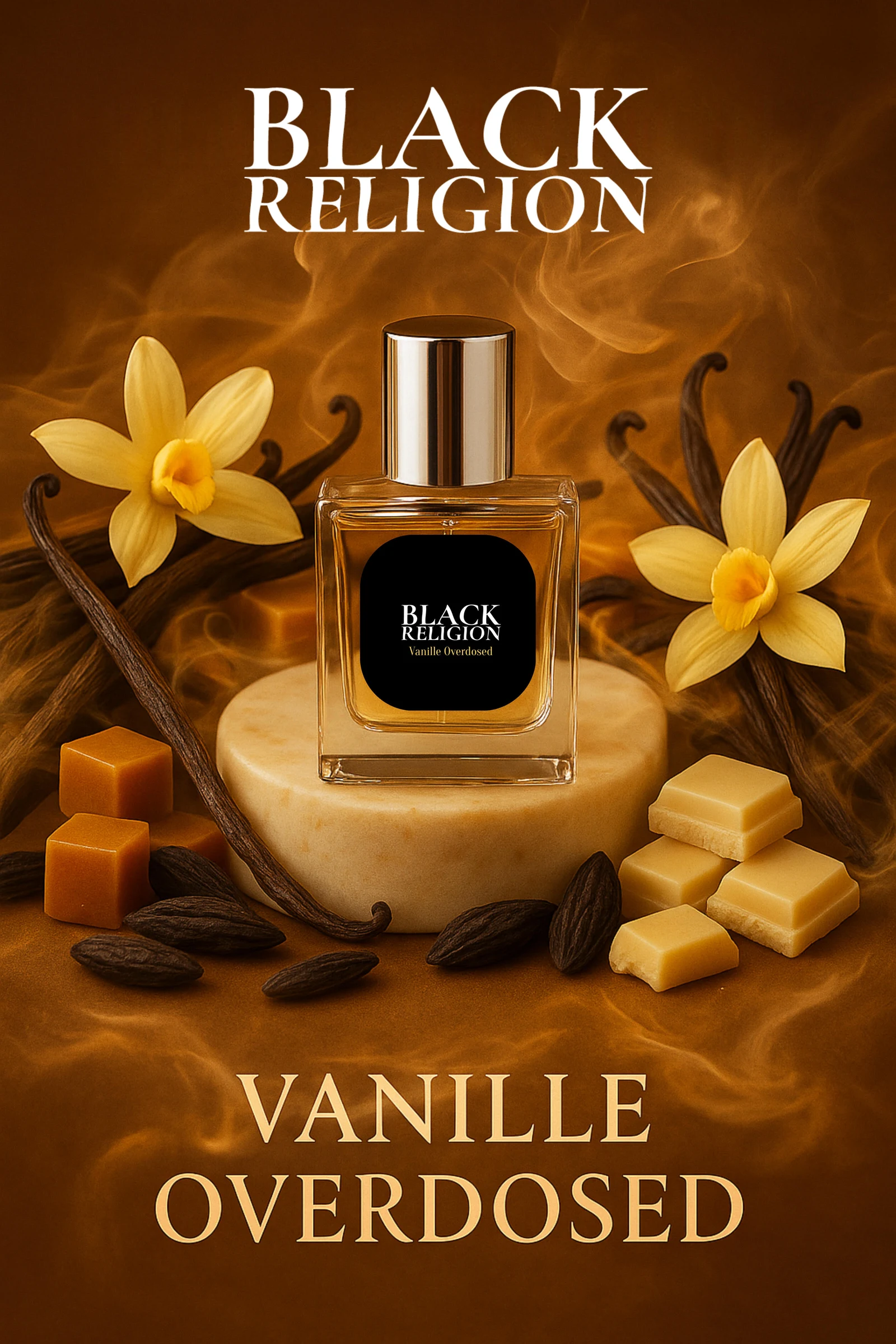 Vanille Overdosed de Black Religion es una creación de la familia olfativa oriental vainilla, diseñada para hombres y mujeres. Esta nueva fragancia, lanzada en 2025, ha sido firmada por el perfumista Máté Benicsák. Su pirámide olfativa se despliega con una salida de frutas secas, que da paso a un corazón de chocolate blanco y flores blancas, para culminar en un fondo intenso y dulce compuesto por vainilla bourbon, vainilla de Madagascar, vainilla de Tahití y caramelo.