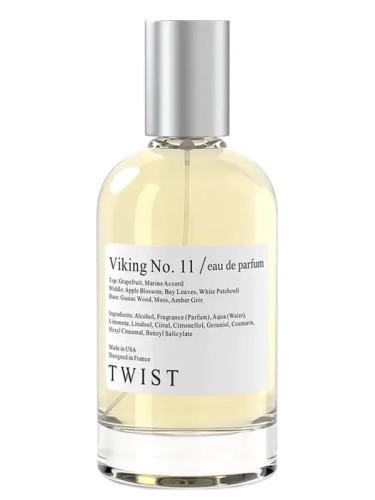 Viking No. 11 de Twist es una fragancia de la familia olfativa Amaderada Acuática para Hombres. Viking No. 11 se lanzó en 2022. Las Notas de Salida son toronja (pomelo) y Notas marinas; las Notas de Corazón son flor de manzano, pachulí y hoja de laurel; las Notas de Fondo son madera de gaiac, ámbar gris y musgo.